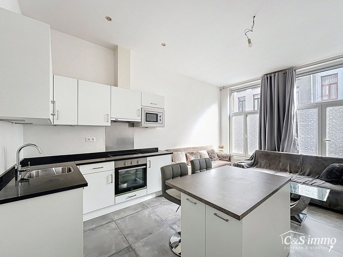 Bij het betreden van het appartement komt u in de lichtrijke woonkamer (22 m²), die naadloos overgaat in een open, volledig ingerichte keuken. De keuken is uitgerust met een microgolfoven, keramische kookplaat en oven, en werd stijlvol afgewerkt met een elegant werkblad in blauwe steen.