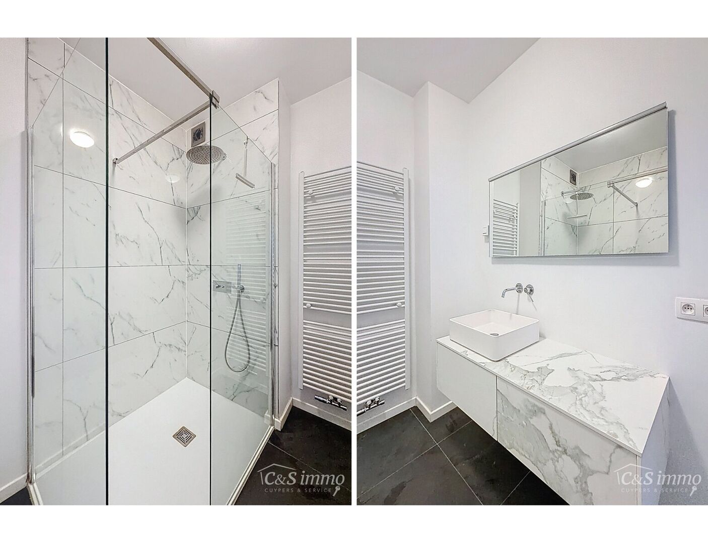 De moderne badkamer, uitgevoerd in stijlvolle marmerlook, is voorzien van een inloopdouche, een badkamermeubel en een handdoekenradiator.
