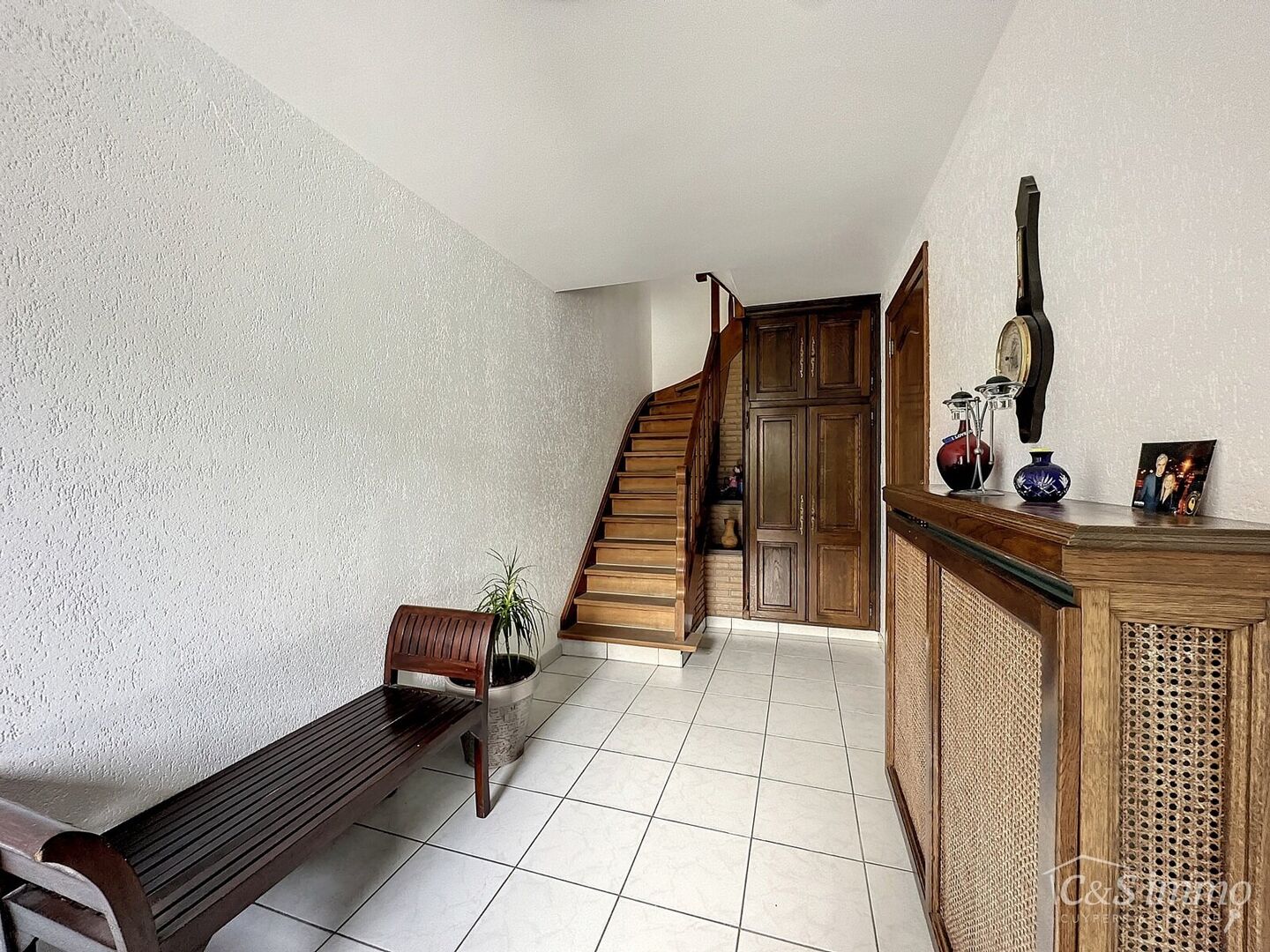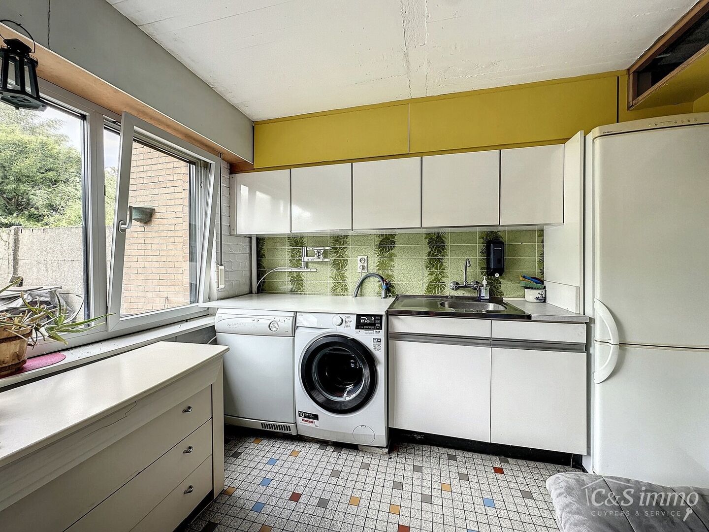 Via de ruime inkomhal betreedt u de woning, met rechtstreekse toegang tot de garage die is uitgerust met praktische maatkasten. Achteraan bevindt zich een aparte bijkeuken/wasplaats, die uitgeeft op de tuin van ca. 75 m².