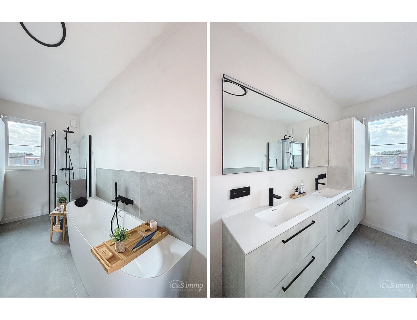 De tweede verdieping omvat drie slaapkamers (14 m², 13 m² en 9 m²) en een luxueuze badkamer. Deze is ingericht met een dubbel wastafelmeubel in Korean, een douche en een ligbad, beide afgewerkt met elegante zwarte inbouwkranen.