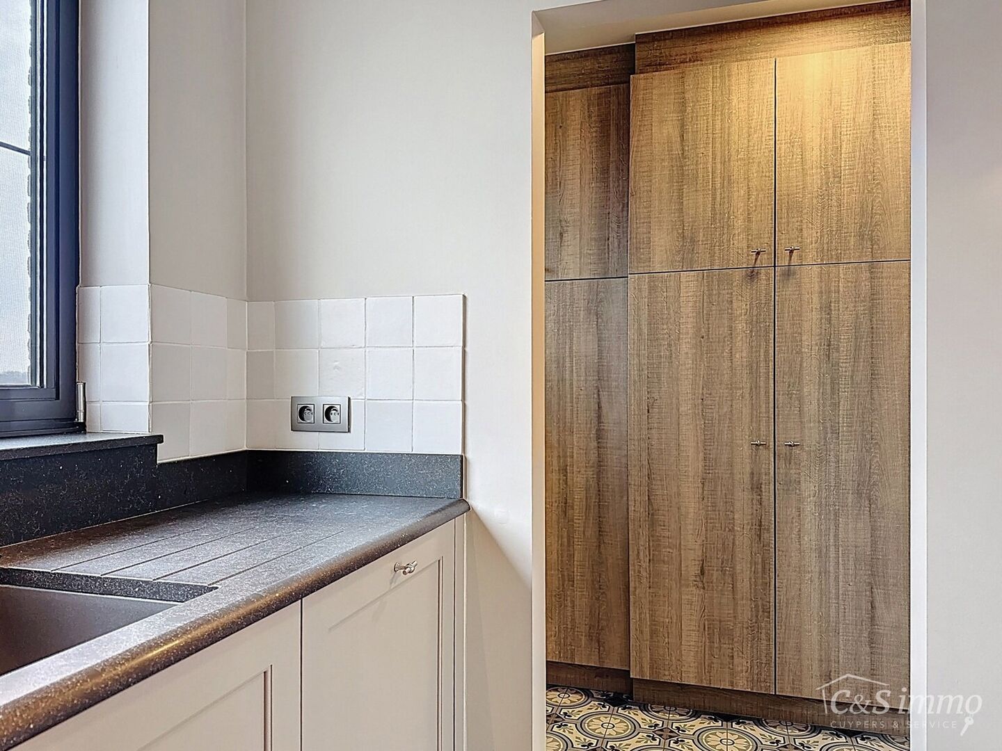 De moderne keuken is volledig uitgerust met kookvuur, dampkap, oven, microgolf en vaatwasser. Naast de keuken bevindt zich een praktische berging met maatkasten.