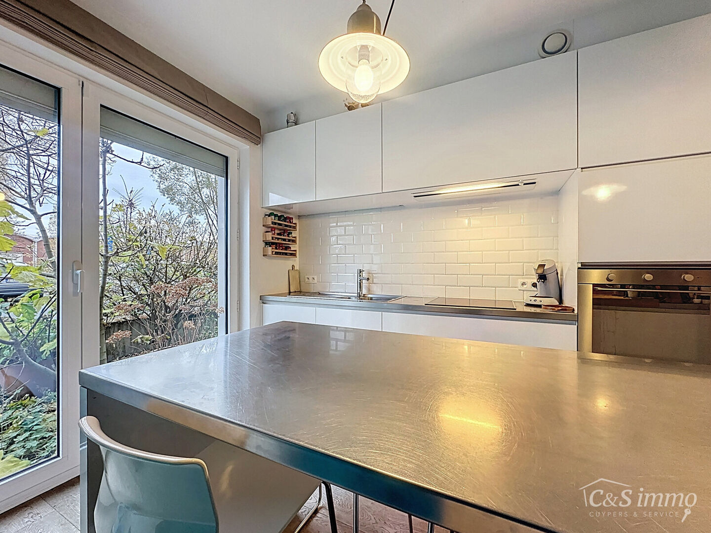 De lichtrijke leefruimte met open keuken vormt het centrale punt van de woning en geniet dankzij de grote raampartijen van een mooi zicht op de aangename tuin.