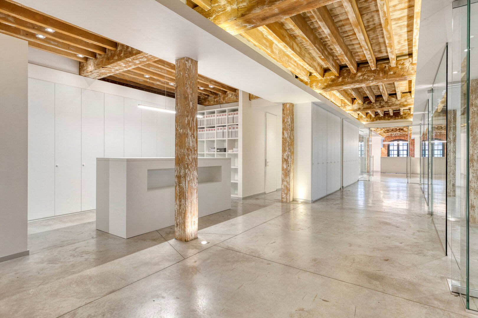 Dankzij de royale raampartijen genieten alle kantoren van een overvloed aan natuurlijk licht. De combinatie van bakstenen muren en originele houten roosteringen geeft de ruimtes een warme en esthetische uitstraling.