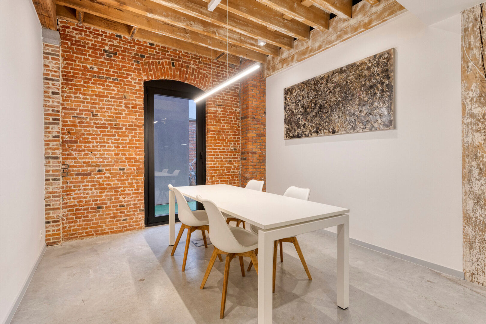 Via het stijlvolle onthaal met ontvangstruimte bereikt u de verschillende kantoren en vergaderzalen. De huidige indeling omvat zeven kantoorruimtes en één vergaderzaal. Daarnaast biedt een polyvalente ruimte of bar, aansluitend op het prachtige terras, een ideale plek voor overleg of informele samenkomsten. De volledig uitgeruste keuken maakt het geheel compleet. Het terras, gelegen aan de rustige achterzijde en bereikbaar via grote schuiframen, creëert een aangename buitenruimte.