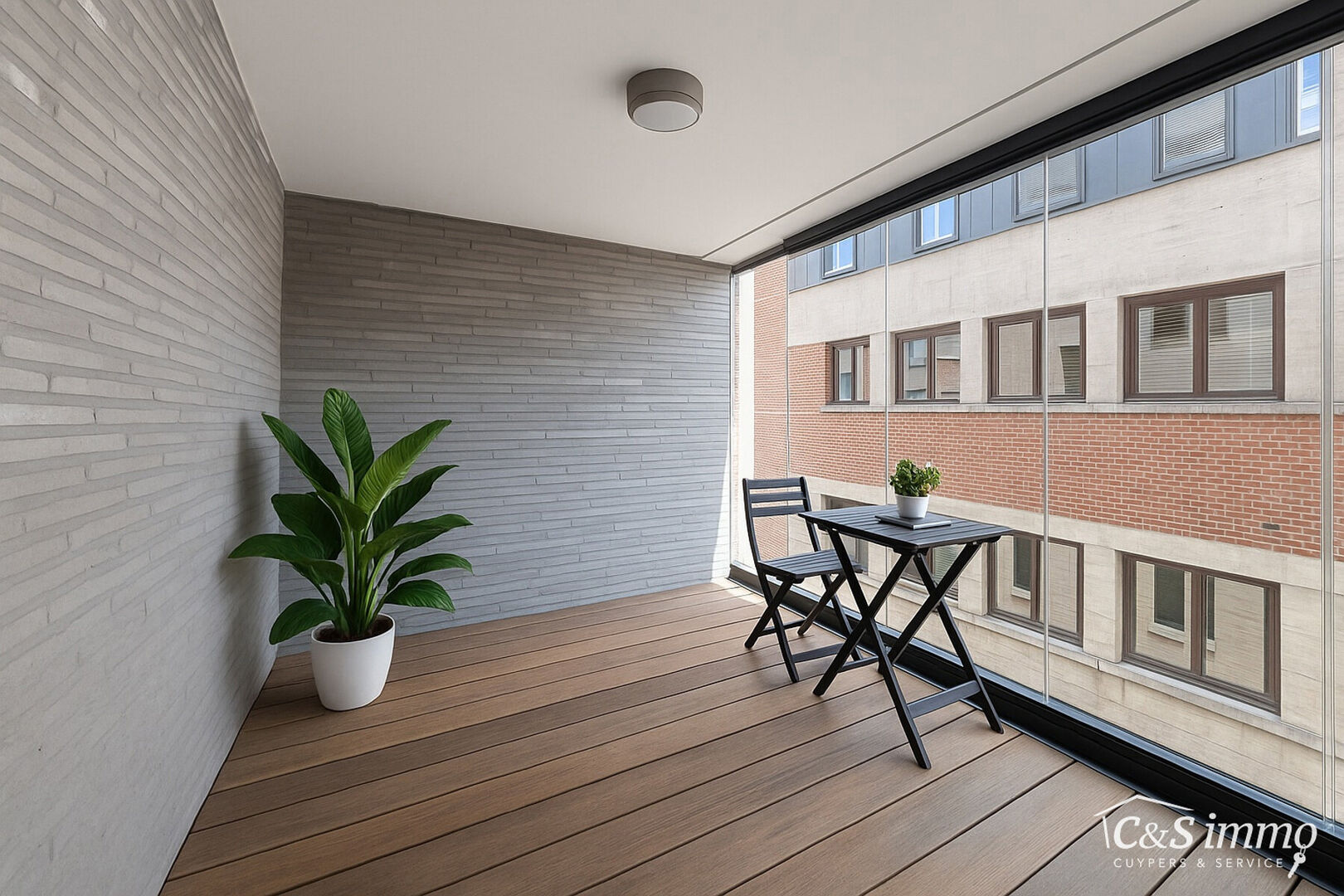 Via de leefruimte heeft u toegang tot een aangenaam terras — ideaal om te ontspannen of te genieten van de stadssfeer.